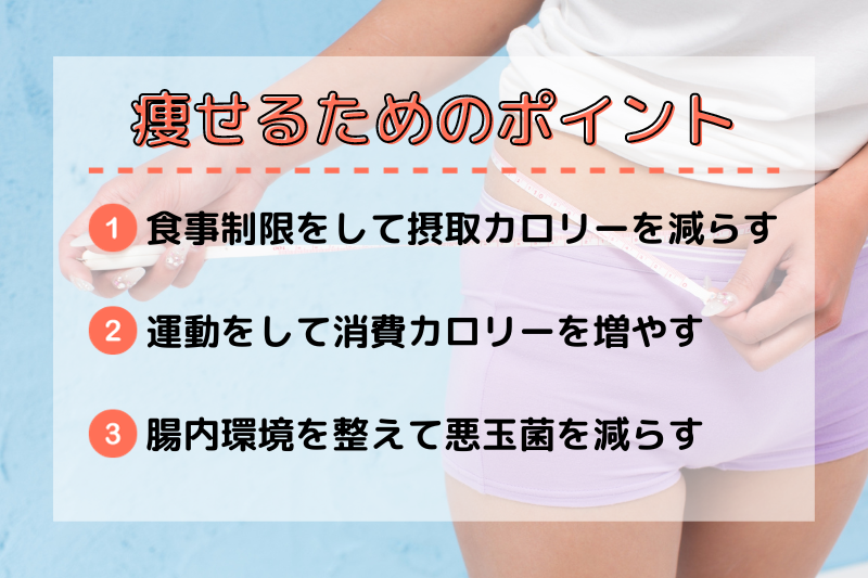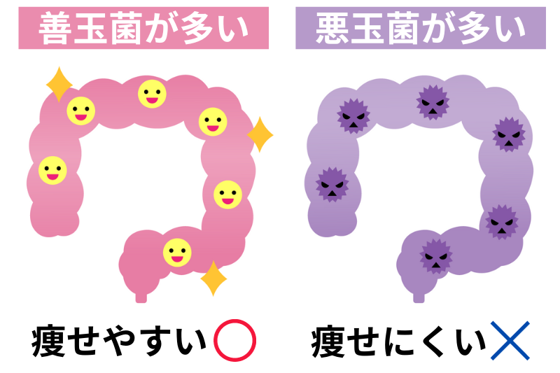 痩せられない人は腸内に悪玉菌が多く、食べたものを消化できず脂肪として体に溜め込んでしまいます…。